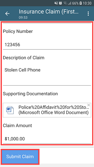 - Open the draft of the Insurance Claim form, complete the form, and tap Submit Claim.
