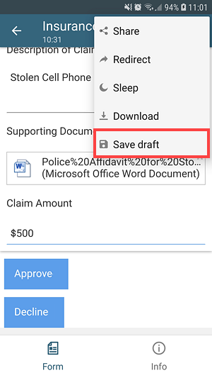- The Insurance Claim task form draft is saved in the Drafts section of the Workspace (Mobile) app.