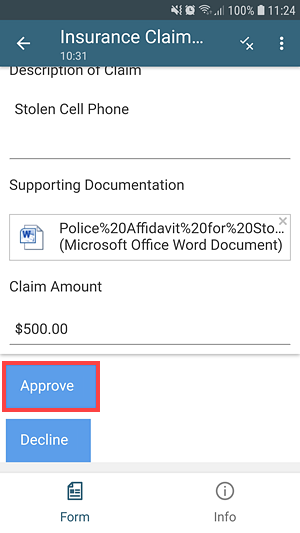 - Open the Insurance Claim Manager Approval task form draft in the Drafts section and tap Approve.