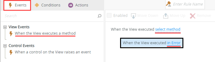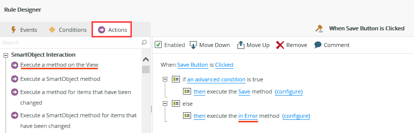 In the example below, you configure a condition to check if two text boxes are populated when the Save button is clicked. If true, the Save method of the view is executed. If the condition is false, you execute the in Error method. Follow the steps below to configure the rule.