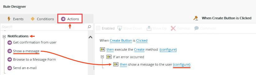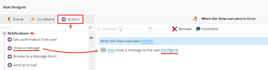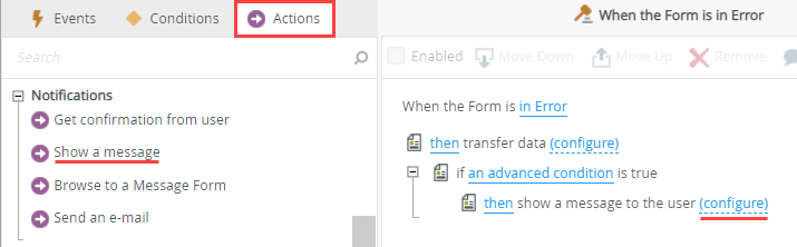 - In the Actions tab, click Show a message and click configure to configure the message.
