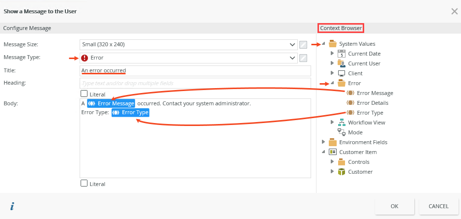 - Select Error from the Message Type drop-down and type An error occurred in the Title field. To use system error values in your message, expand the System Values node in the Context Browser. Then expand the Error node and drag the details you want to use into the Body of the message. You can also combine the system details with custom text as shown below. When you're done configuring the message, click OK.