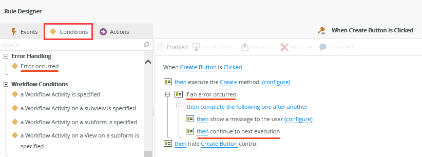 Use the if an error occurred condition to conditionally manage the execution of a rule if an error occurs. You can also use the Stop rule execution and Continue to next execution rule actions to determine whether execution of the rule should continue. When you use the if an error occurred condition, the rule stops automatically when there is an error, but it is a good idea to add the Stop rule execution action for discoverability and maintenance. The images below are examples of how you can use the if an error occurred condition with the Stop rule execution and Continue to next execution rule actions. In the first image, rule execution is stopped when the error occurs and the New Customer workflow is not started. In the second image, rule execution is stopped automatically when the error occurs, but then continued so that the Create button is hidden.