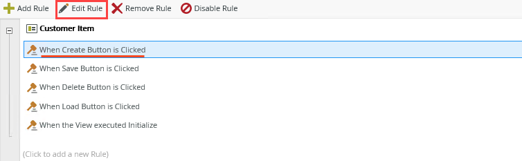 - Go to the Rules tab, select the default When Create Button is Clicked rule and click Edit Rule.