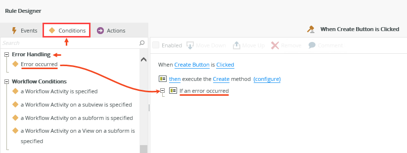 - Using Conditions to check for errors, for example if you want to stop executing actions in a rule if an error occurs