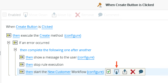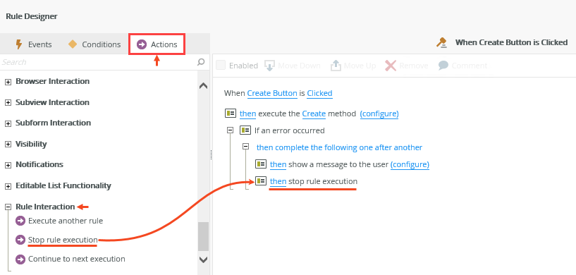 - Go to the Rule Interaction section and select Stop rule execution. The if an error occurred condition causes the rule to stop if an error occurs, but it is a good idea to add this action to your rule so that other people can understand the rule. Rule execution happens in the following order: When the Create button is clicked, the Create method executes and, if an error occurs, a message is shown and the rule stops executing.
