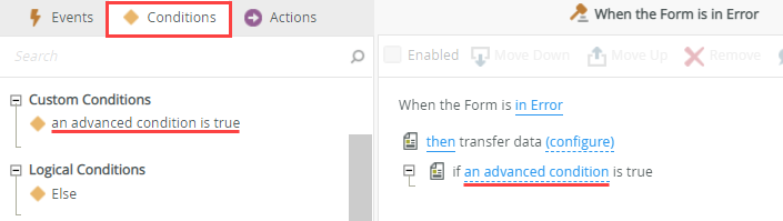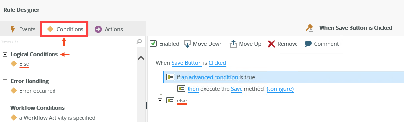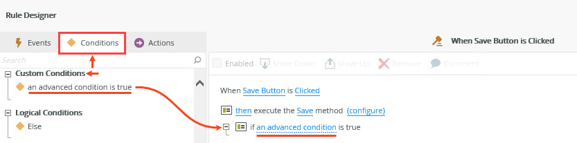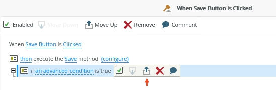 - Hover over the condition and click the icon as shown below to move the statement up one position. You want to execute the Save method if the condition evaluates to true. Click an advanced condition to configure the condition.