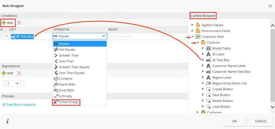 - In the Rule Designer click Add, expand the view in the Context Browser, expand the Controls, and drag the text box you want to use in the condition to the Left field. Select Is Not Empty from the Operator drop-down.