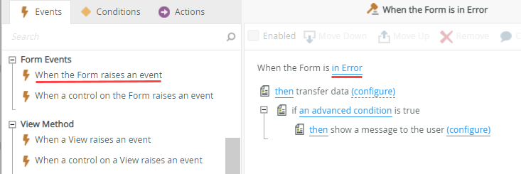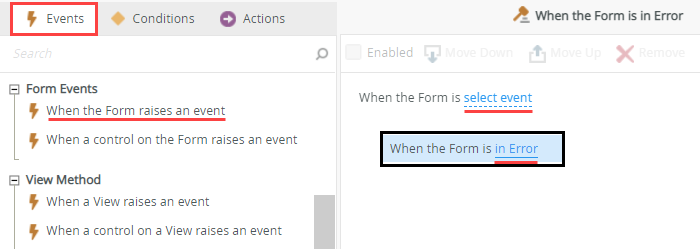 - In the Events tab, click When the Form raises an event and then select in Error.