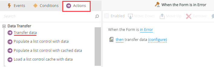 - From the Actions tab, select Transfer data. No configuration of the action is required.