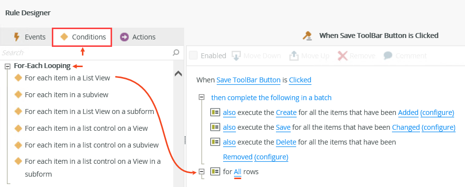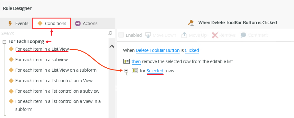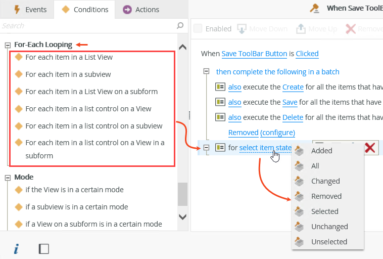 You can use the For-Each Looping conditions on list views and list controls to perform actions for all items that meet a specified condition, such as to remove selected records from a list or execute a create method for all items when a condition is true. Use looping conditions with other If conditions or on their own.