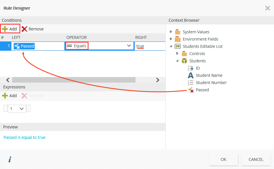 - Click Add and specify conditions containing a value on the left, an operator, and a value on the right. You can type a value or use the Context Browser to drag and drop a value. In this case, you need to create a new record for each student who passes their current class. See Configure Advanced Filter Conditions for more information about advanced conditions.