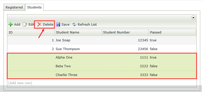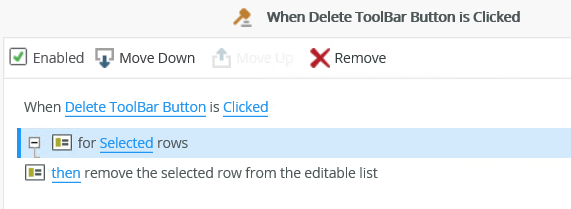 - The rule removes all selected rows when the Delete Toolbar Button is clicked.