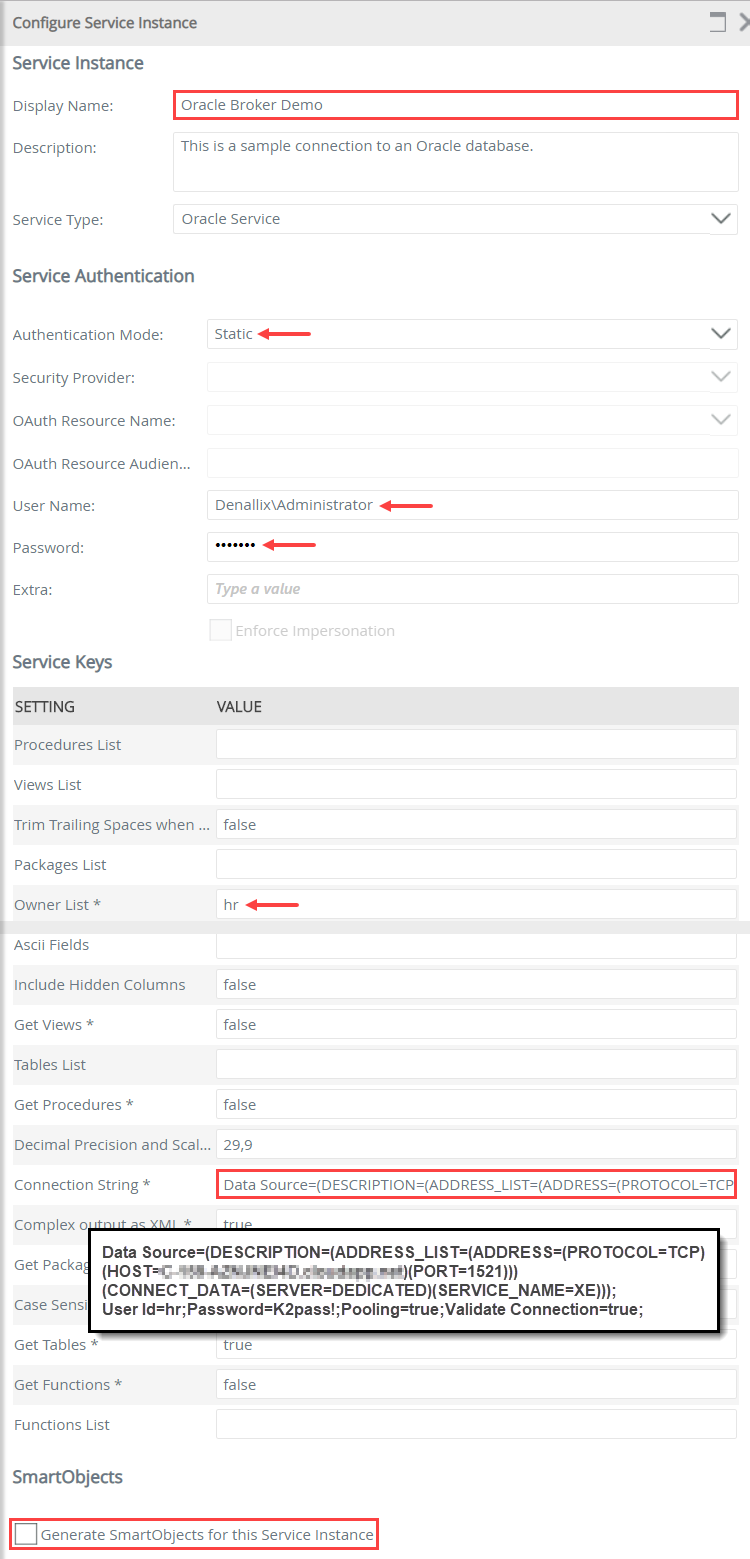 - Complete the string values. Your service instance configuration is unique to your Oracle environment. You may need to contact your Oracle administrator to know which settings are required to access your environment and the necessary values. The image below reflects an example environment and is likely different for your environment. Do not select the option to generate SmartObjects as you build one from scratch in a later step. Click OK to create the service instance. Click OK when you see the instance created dialog.While your connection string is unique to your environment, note that the system requires the value: Validate Connection=true;