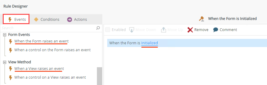 The Initialized event executes after the view or form's loading spinner stops. Use the Initialized event with rule actions that don't have to wait for the view or form spinner to finish. For example, List controls can load their list values without waiting for a loading/spinner that blocks the view or form. They contain their own spinners to indicate when they are not fully loaded, and can be used with the Initialized event to load after the view or form has loaded.
