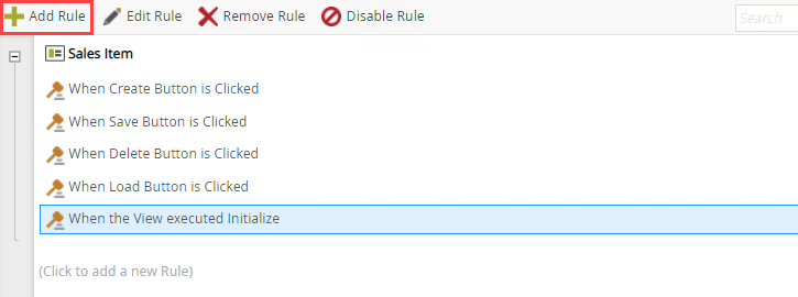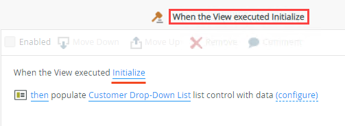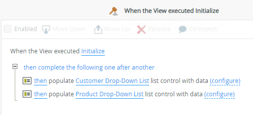 In this example, you have a view containing two drop-down controls called Customer Drop-Down List and Product Drop-Down List. When you configure drop-down controls on a view, the system automatically creates a default rule called When the View executed Initialize, which populates the drop-down controls when the view opens. The image below shows the default Initialize rule for this example.