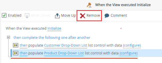- Select the then populate Product Drop-Down List list control with data action and click Remove. When the view opens, only the Customer Drop-Down List control is populated. Click OK to save the rule.