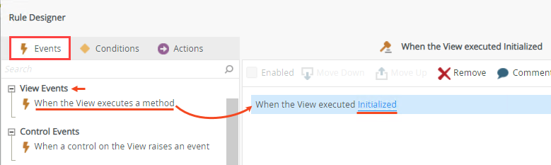 - In the Events tab, click the When the View executes a method event in the View Events section, and then select Initialized as the event, as shown below.