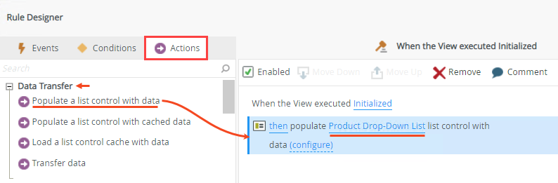 - Select the Actions tab, click the Populate a list control with data action in the Data Transfer section, and then select the Product Drop-Down List control as shown below. Click OK to save the rule. When the view has loaded and the Customer Drop-Down List control is populated, the view is available for editing and the Product Drop-Down List control is populated.