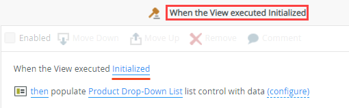 Enhanced rule configuration of the Initialized event containing the populate Product Drop-Down List control action