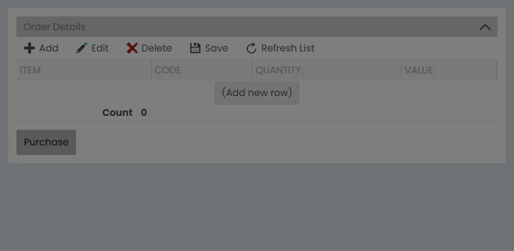 - On the Order Details view, click Add or (Add new row) and do not add any information in the new row. Click the Purchase button.