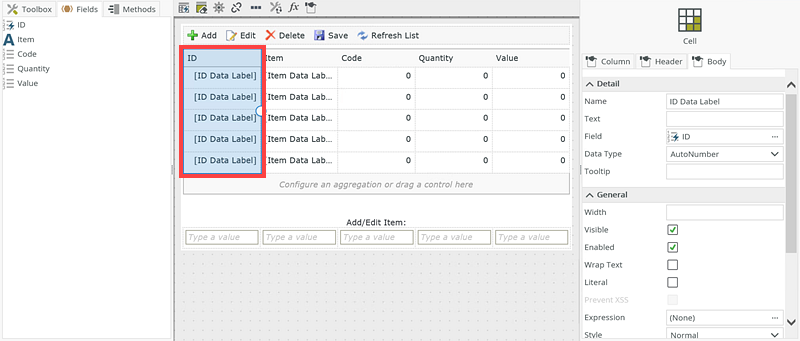 Properties Type Key Required Unique ID Autonumber Yes No Yes Item Text No No No Code Number No No No Quantity Number No No No Value Number No No No