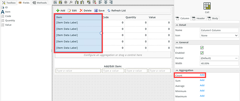 - Select the Item column and click Count in the Aggregation section. The purpose of the Count is to count how many rows are in the Order view. Later in this how-to, you will use the count option in a rule; if the count is 0, a message will display.