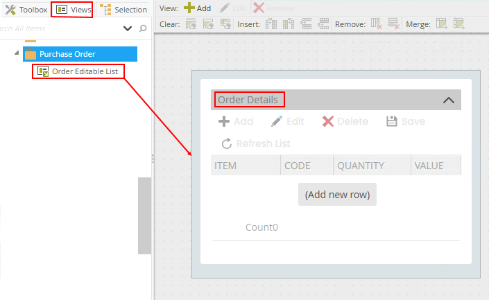 - Add the Order view to the Purchase Order form. Enter Order Details as the view title.