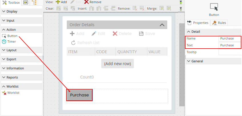 You now configure the form rule for the Purchase button. The form rule uses the count option you added to the Item column of the Order Details view. If the count is greater than 0, then row is saved, if the count is less than 0, a message is shown, stating that the rows are blank.