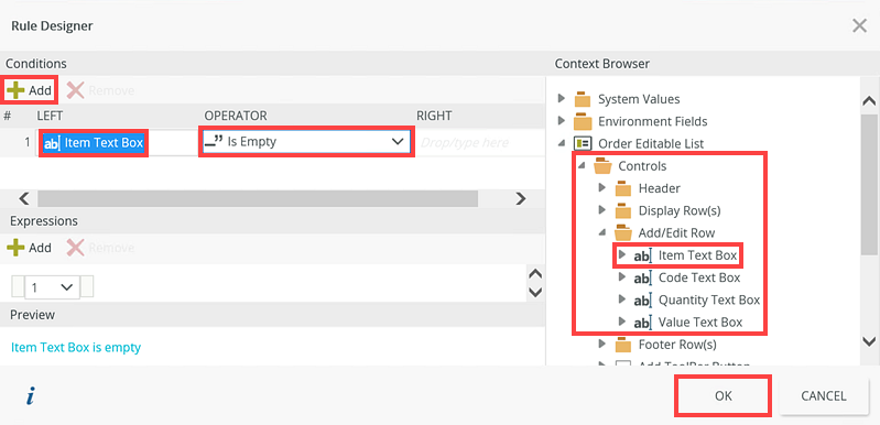 - On the Rule Designer page, click Add.Add the Item Text box from the Controls > Add/Edit Row in the Context Browser. In the Operator section select _" Is Empty. Click OK.