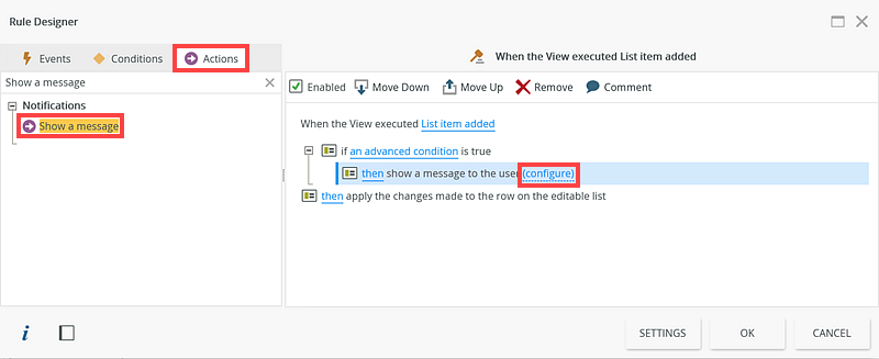 - On the Rule Designer page select the Actions tab, add another Execute a View method rule and click select View. Select the Order Editable List view and click select Method. Select the Save method and click configure.