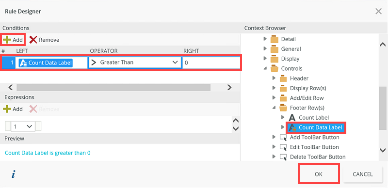 - On the Rule Designer page click Add. Add the Count Data Label from the Order Editable List > Controls > Footer Rows in the Context Browser. In the Operator section select > Greater Than and add 0 in the Right section. Click OK.