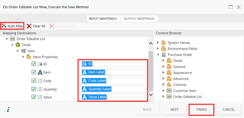 - On the On Order Editable List View, Execute the Save Method page, click Auto Map in the Input Mappings section and click Next. There are no Output Mappings, click Finish.