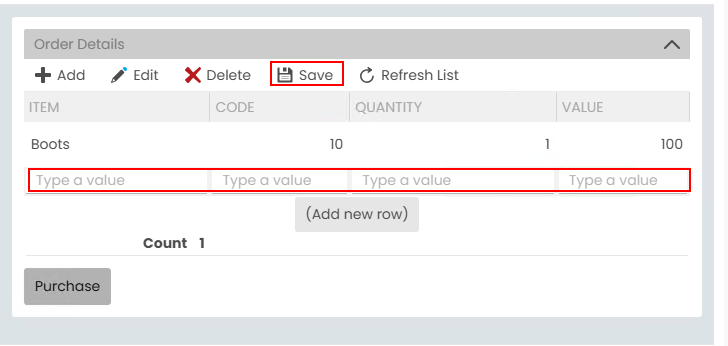 - On the Order Details view, add a new row and only enter information on the Code, Quantity and Value fields and click Save or click out of the newly added row.