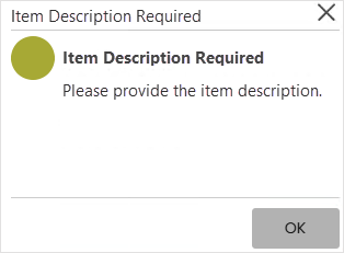 - Notice the Item Description Required message displays because the Item field on the Order Details view is empty. Click OK.