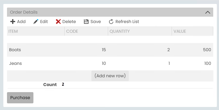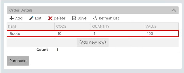 - Complete the newly added row and click Save then Purchase. Notice the row is saved because the Count aggregate is greater than 0.