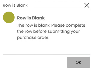 - On the Show a Message to the User page, add Row is Blank to the Title and Heading fields and add The row is blank. Please complete the row before submitting your purchase order. in the Body field. Click OK.