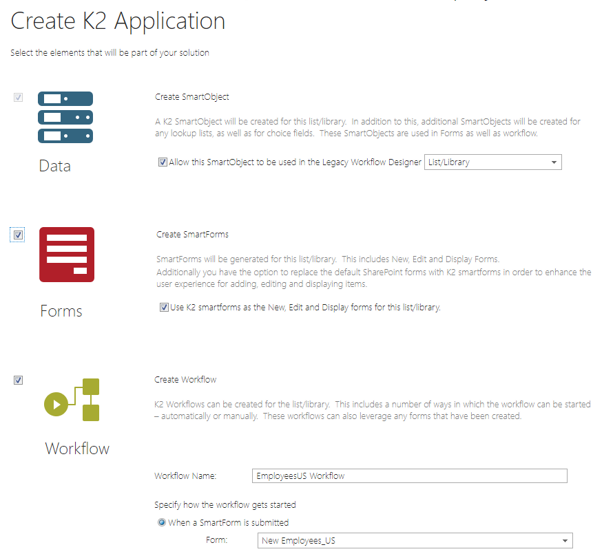 2. Select the Create SmartForms option on the Create K2 Application page