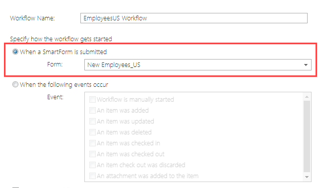 5. Keep the default selection of Specify how the workflow gets started > When a SmartForm is submitted > Form: New Employees_US