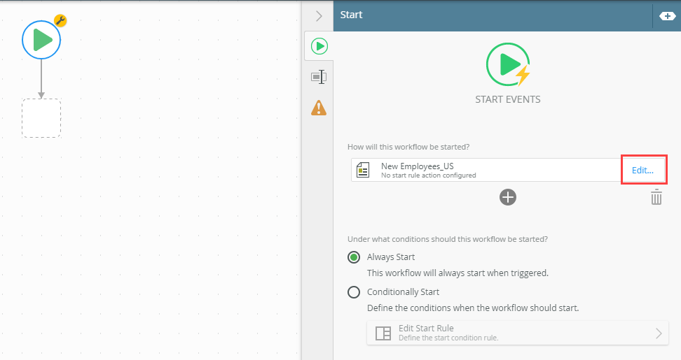 1. Expand the start event and click the Edit link in the How will this workflow be started? section