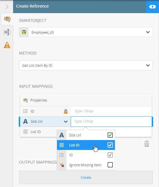 6. Click the output mappings Create to create the Employees_US Attachment reference