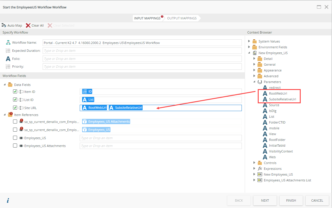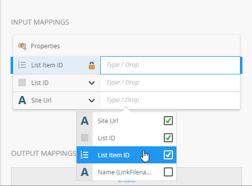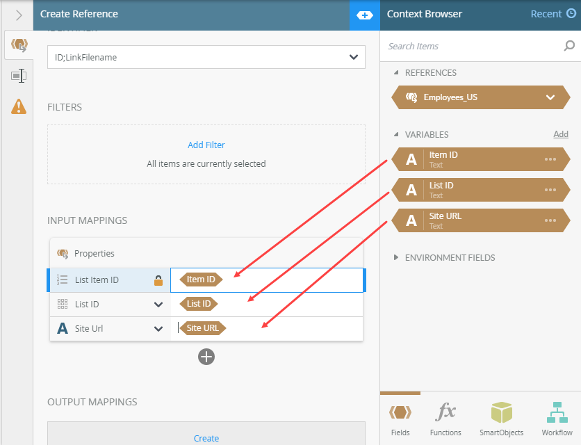 5. Drag the Item ID, List ID, and Site URL variables from the context browser into the matching input mappings