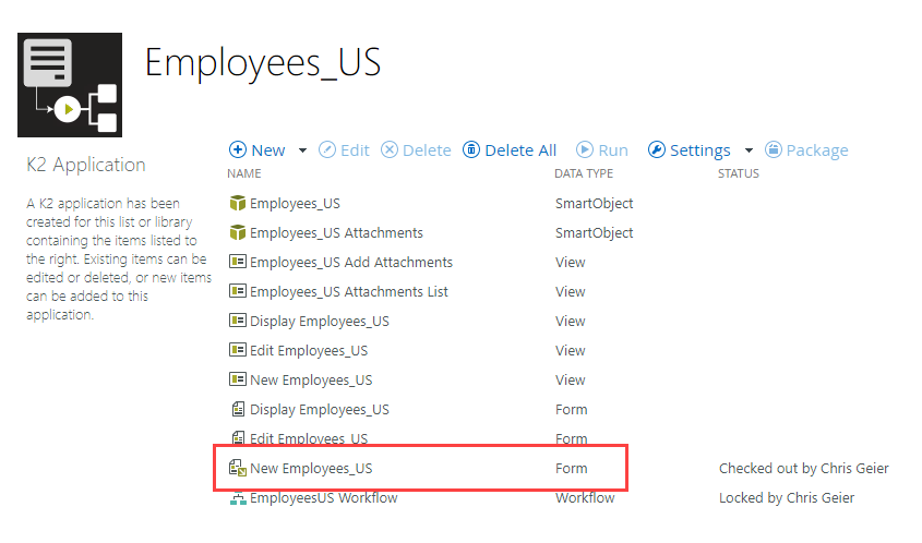 1. For your Employees_US list, select the K2 Application icon from the list menu bar