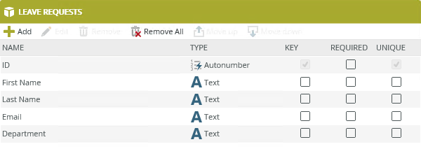 - Create a SmartBox SmartObject called Leave Requests. Add at least three properties. (Use the image below as a guide, if necessary.) Finish the SmartObject to save and exit.
