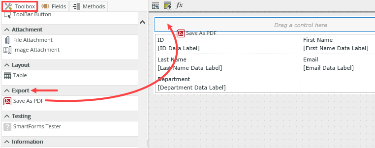 - Edit the Leave Requests Item view. On the left side of your screen, click the Toolbox tab. Locate the Export heading, then drag the Save As PDF control onto the design canvas at the top of the view.
