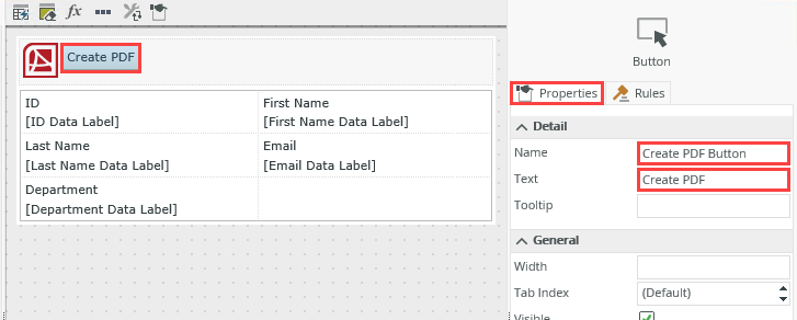 - In the Toolbox, locate the Action heading. Drag the Button control onto the canvas to the right of the PDF control.