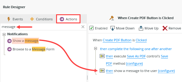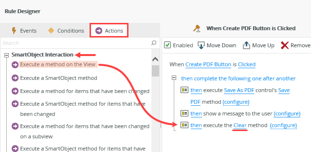 - This rule does not contain any conditions, so click the Actions tab. You want to execute the method that creates a PDF file. Locate the Control Interaction heading and click Execute a control's method to add it to the rule definition pane. Click the select control link and change it to Save As PDF. Click the select method link and change it to Save PDF.The Save As PDF control has two methods: Save PDF and Save PDF Async.