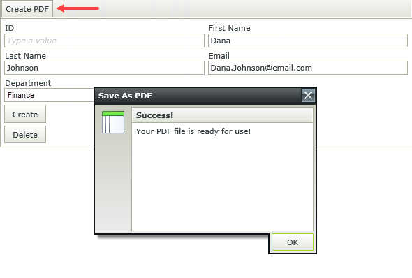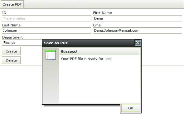 - Complete the view fields, with the exception of ID. (The ID is an autonumber that the system adds when creating a record in the SmartObject.) Click Create PDF. You see the confirmation message (that appears after the system creates the PDF file). Click OK. Notice the view fields clear, allowing you to input new details.