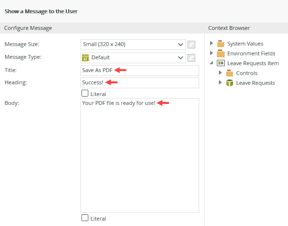 This control has two methods: Save PDF executes synchronously while Save PDF Async executes asynchronously. For more information and considerations, see Save As PDF Control in the User Guide. New Action: Show a message Configure the message so that it confirms the successful creation of the PDF file. This action serves two purposes. It informs the user that their PDF file is ready for use. It also confirms that there were no errors during the file creation as this action executes after the PDF is created. New Action: Execute a method on the View Method = Clear This clears the view fields and allows you to enter another request. - Edit the Leave Requests Item view. On the left side of your screen, click the Toolbox tab. Locate the Export heading, then drag the Save As PDF control onto the design canvas at the top of the view.