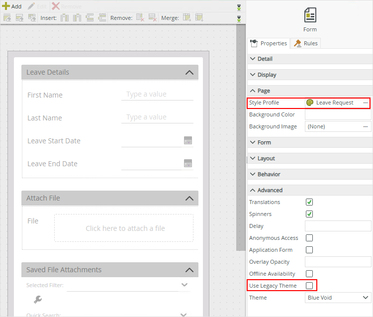 - In the Advanced section, deselect the option Use Legacy Theme if it is selected. This property is applicable to legacy themes. To apply the style profile to your form, you must deselect this option.